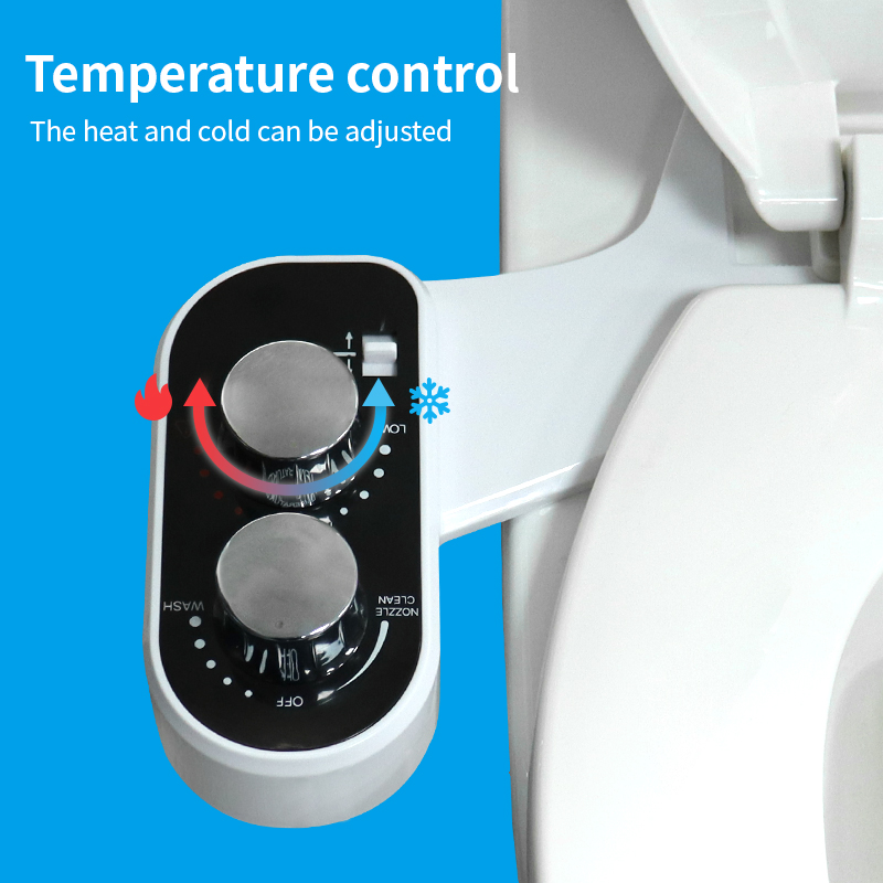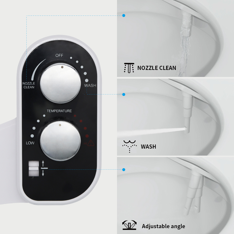 【360°Self cleaning Nozzle】 You can simply turn to the 360″self-cleaning mode byturning left the front knob after every use of the bidet hot water and automaticallyretracts when it is turned off, Helps you enjoy a more hygienic and clean washing experience.