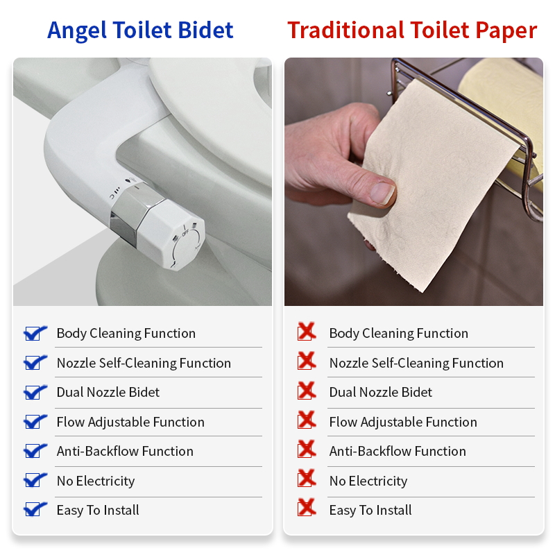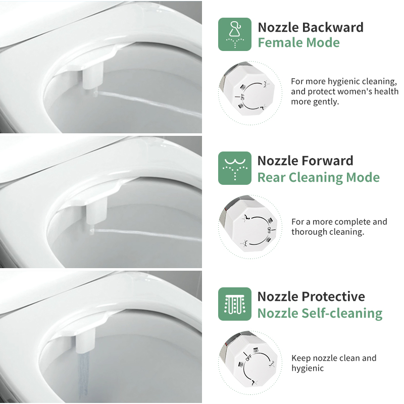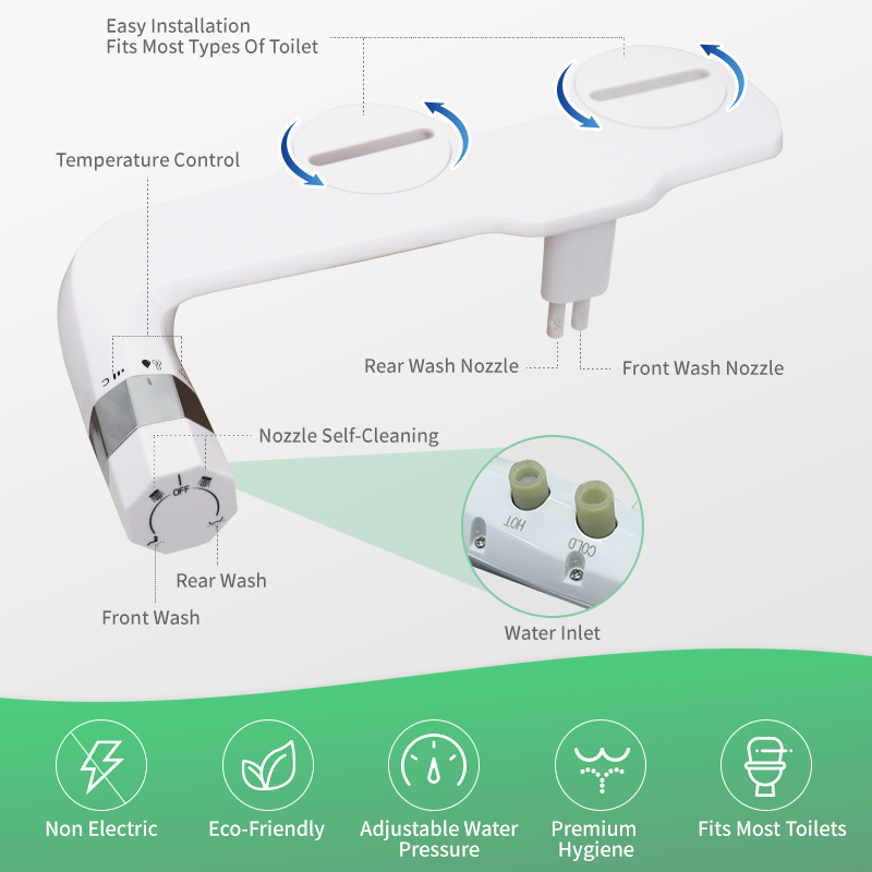 【Hygiene protection 】– Our non-electric bidet features dual nozzles, offering two spray modes. The feminine wash sprays a gentler stream forward, while the posterior wash sprays a stronger stream backward. Self-cleaning function thoroughly cleans the nozzles, with retractable nozzles automatically retracting behind a convenient removable guard door, providing you with dual hygiene assurance.